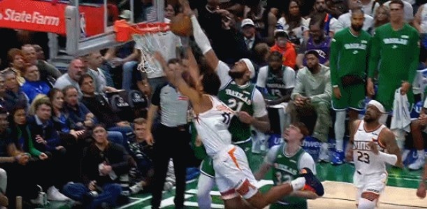 Không có vùng bay trên không! Iguodaro lướt đi để thực hiện cú ném bóng, nhưng Gafford đã từ chối nó bằng một tay.