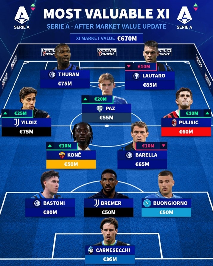 Đức đã cập nhật bảng xếp hạng giá trị cầu thủ và 11 cầu thủ đá chính đắt giá nhất ở Serie A cũng đã được ra mắt. Lautaro và Thuram của Inter Milan dẫn đầu tiền đạo, còn cầu thủ Pulisic của AC Milan được chọn.