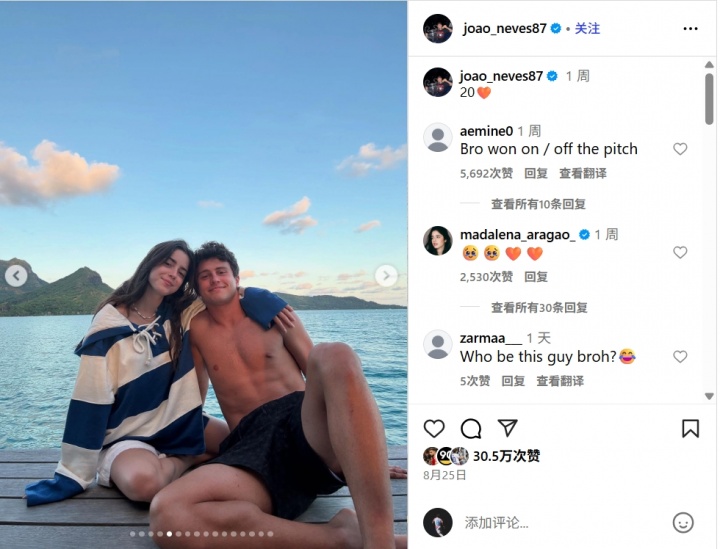 Tiền vệ Paris Joao Neves đã đăng một bức ảnh lên phương tiện truyền thông xã hội để chúc mừng sinh nhật lần thứ 20 của cô cho bạn gái Madalena, và bạn gái của cô cũng đã tương tác với cô trong phần bình luận.