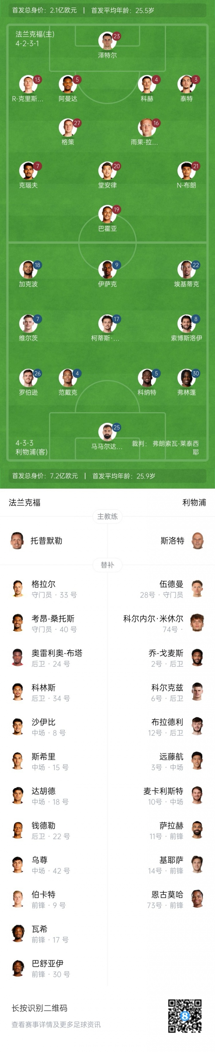 Ở vòng 3 UEFA Champions League, Liverpool thi đấu trên sân khách Frankfurt. Đội hình xuất phát của hai bên đã được công bố trước trận đấu. [Đối với Liverpool, Isaac, Wirtz và Gakpo đều đá chính, còn Ekitic sẽ đối đầu với câu lạc bộ cũ; cho Frankfurt, Tang Anlu, Larsson và Brown dẫn đầu đội hình xuất phát]