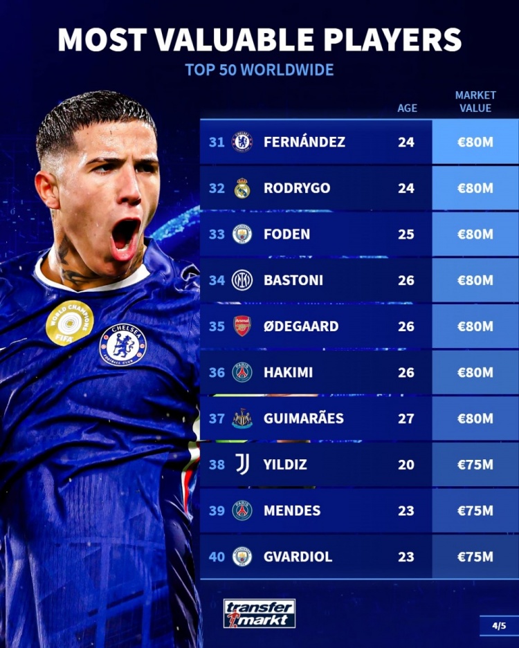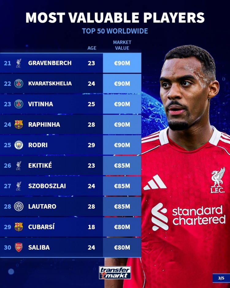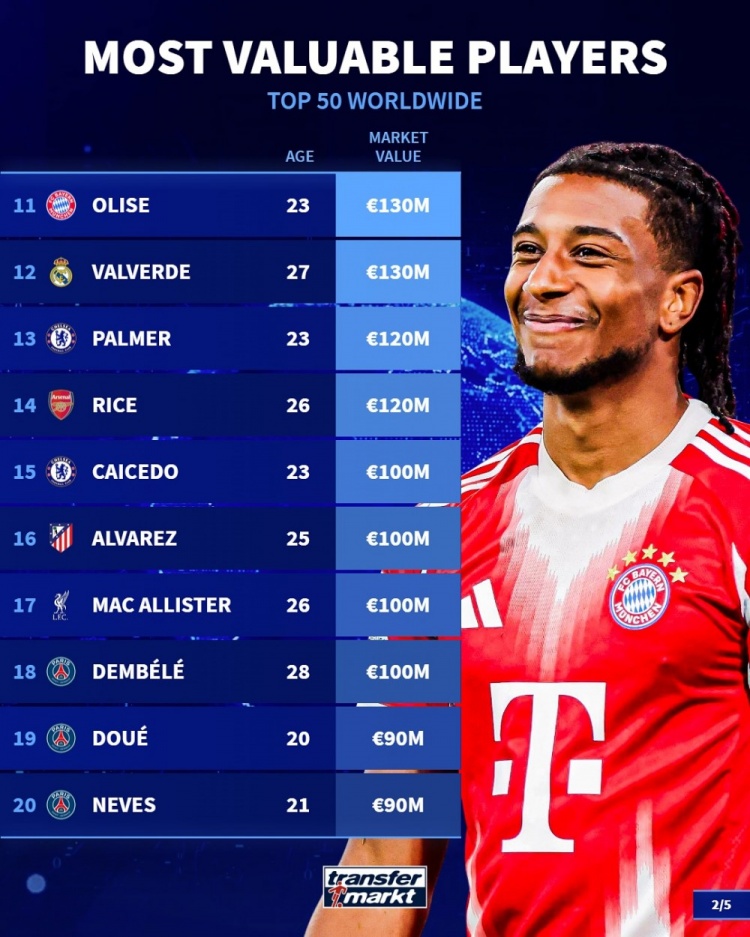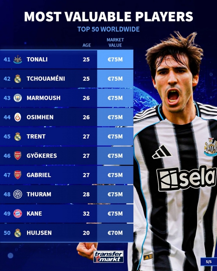 Thị trường chuyển nhượng Đức liệt kê 50 cầu thủ có giá trị cao nhất, trong đó Yamal đứng đầu với 200 triệu euro, tiếp theo là Bellingham, Haaland và Mbappé với 180 triệu euro.