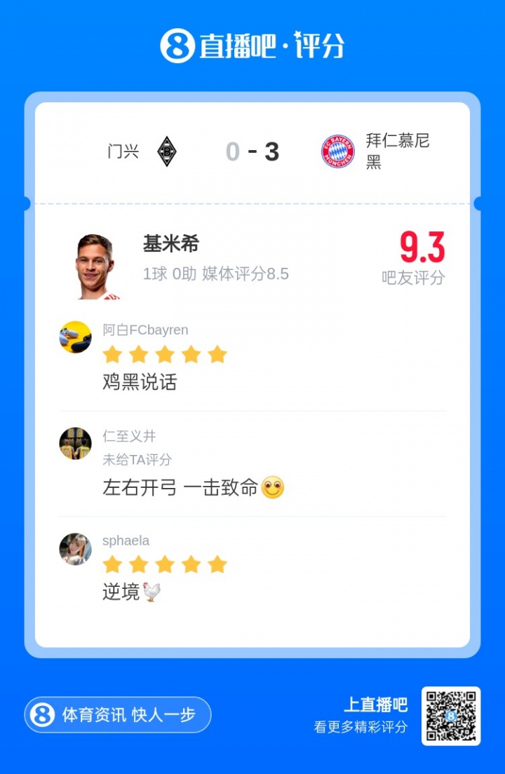 Kết quả của vòng tuyển chọn thứ tám đã được công bố. Kimmich mở tỉ số, giúp Bayern đánh bại Borussia Monchenladbach 3-0 trên sân khách và giành 8 chiến thắng liên tiếp để dẫn đầu Bundesliga. Cuối cùng, anh đã nhận được 14.000 phiếu bầu từ cư dân mạng và được bầu là [Cầu thủ xuất sắc nhất vòng 8 X Xiaohongshu Bundesliga]!