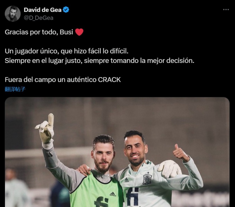 de Gea đã đăng một bức ảnh của mình bằng busquets và viết: "Cảm ơn bạn vì tất cả mọi thứ, Gian hàng ❤.